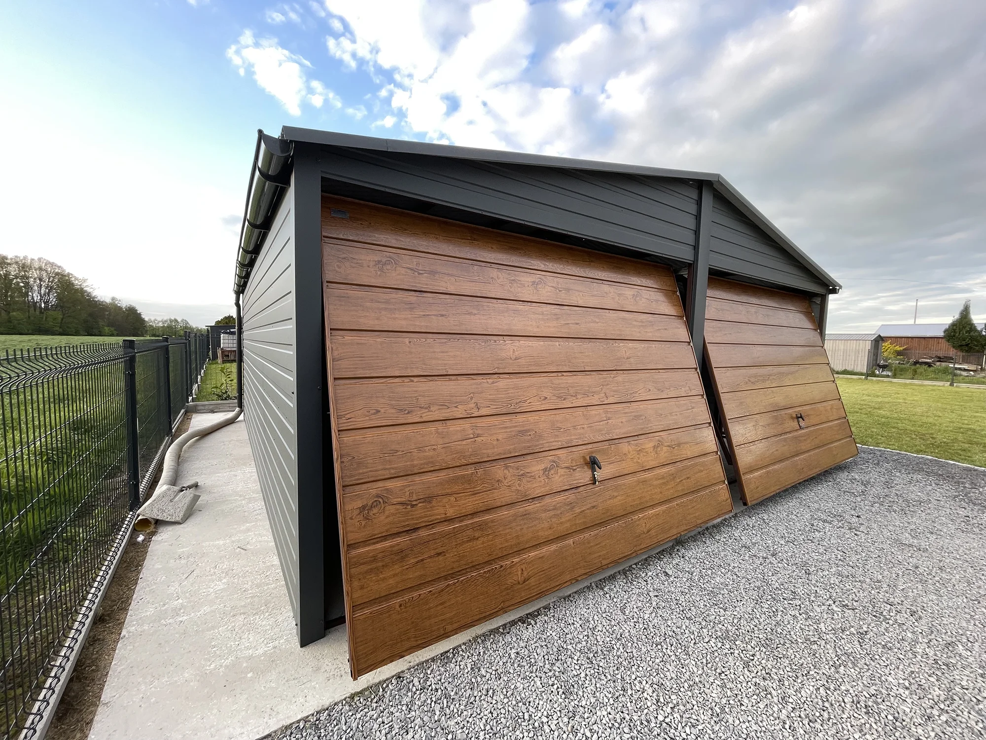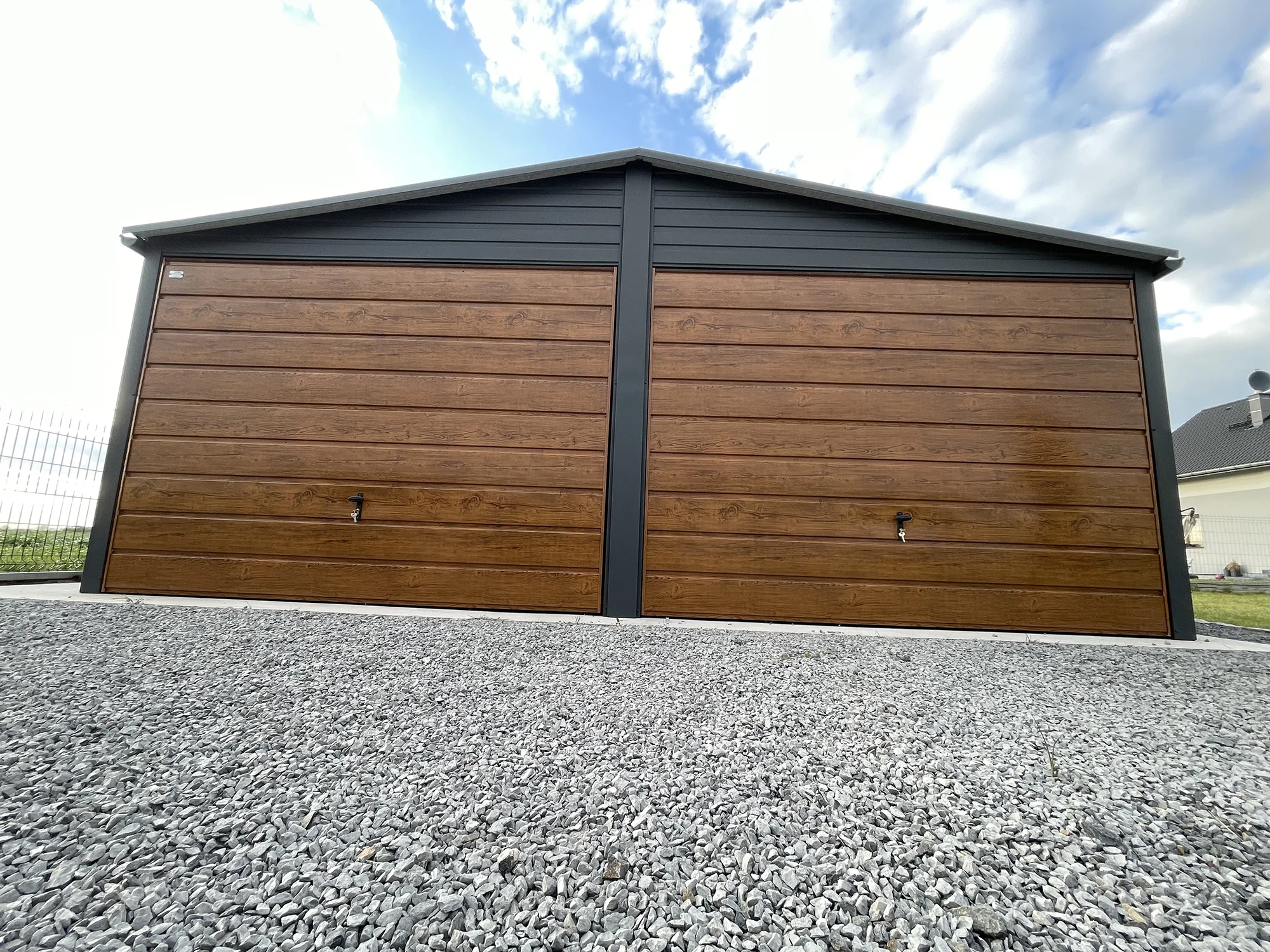 Wykończenie w kolorze antracyt i złoty dąb sprawia, że garaż prezentuje się estetycznie na posesji prywatnej, przy firmie lub na działce. To trafny wybór dla osób, które szukają dopracowanego garażu blaszanego w wersji PREMIUM.